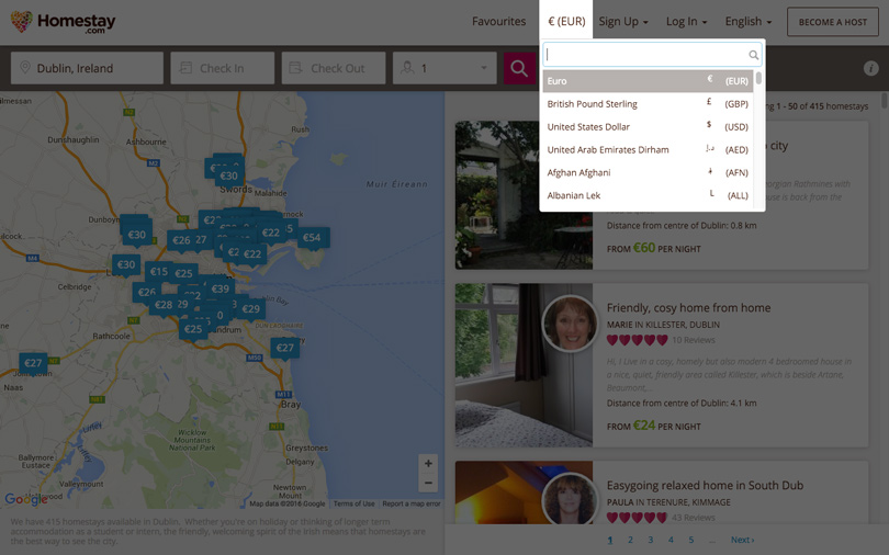 Los precios en Homestay.com se muestran en función de las preferencias del huésped. El huésped puede elegir qué moneda quieren ver los precios al navegar en homestay.com en la parte superior de la página.